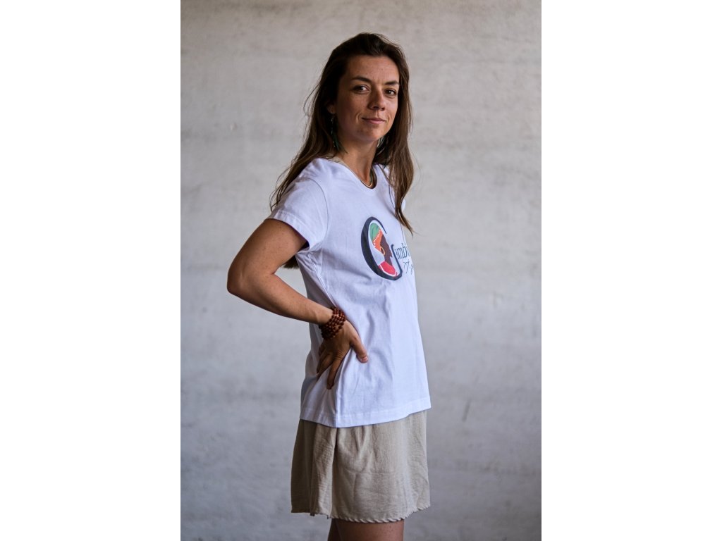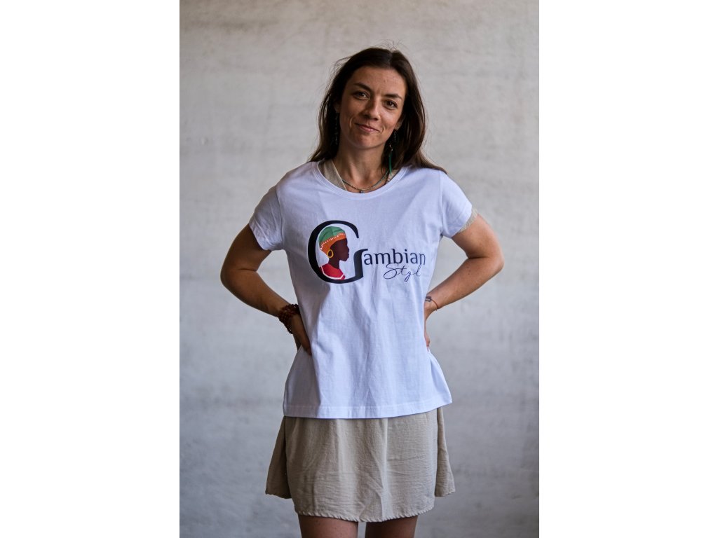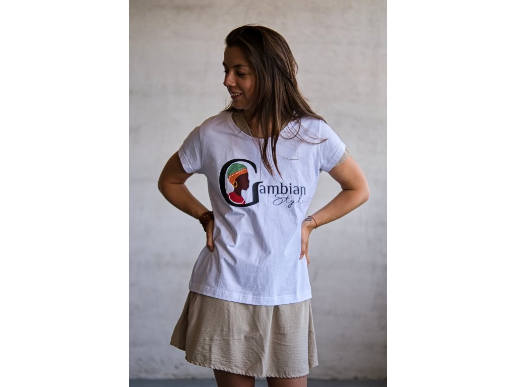 Toto dámské tričko v bílé barvě s originálním logem Gambian Style je ideální volbou pro všechny, kdo chtějí propojit jednoduchost s výraznou identitou značky inspirované africkou kulturou. Tričko je vyrobené z příjemného bavlněného materiálu, který zajišťuje pohodlné nošení během celého dne.