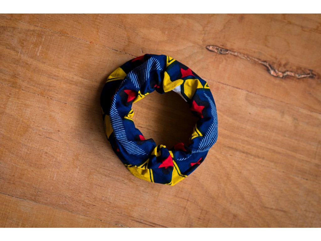 Modro-žluto-červená gumička do vlasů ze stoprocentní bavlny je praktický doplněk pro každodenní nošení. Přírodní materiál zajišťuje pohodlné uchycení vlasů bez tahání a nepříjemného tlaku.