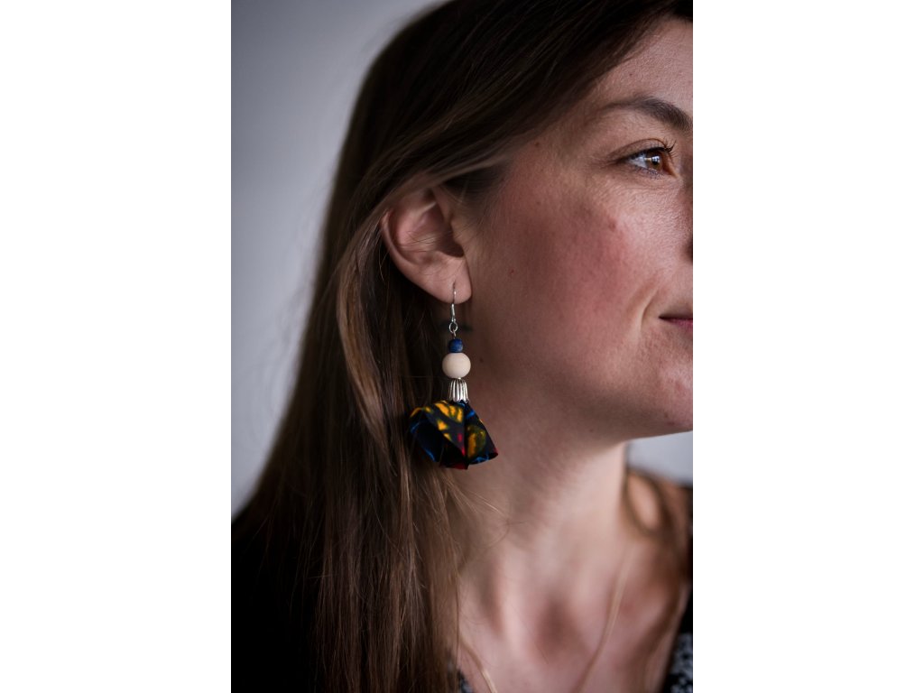 Originální náušnice z afrických látek typu waxprint jsou ručně vyráběné s důrazem na detail a jedinečný styl. Kombinace 100% bavlny, barevných korálků a afroháčků vytváří nápaditý doplněk, který oživí každý outfit. Lehké a pohodlné pro každodenní nošení i speciální příležitosti.