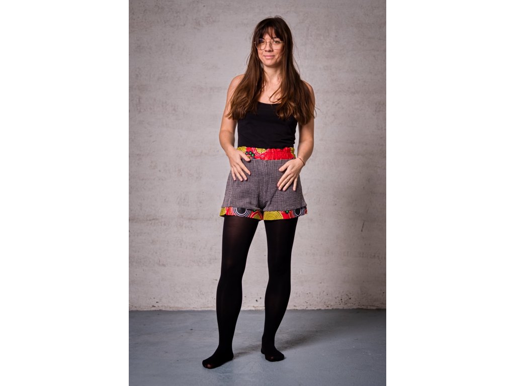 Žluté šortky z mušelínu ozdobené africkou látkou představují netradiční spojení lehkého mušelínu a bavlněného afrického plátna. Tato kombinace zajišťuje maximální pohodlí při nošení a zároveň originální design, který zaujme na první pohled.