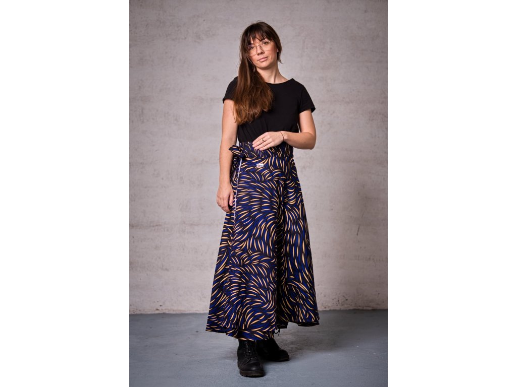 Elegantní zavinovací sukně ze stoprocentního bavlněného plátna tištěného technikou waxprint temně modré barvy s jemným béžovým vzorem je vhodná na volnočasové aktivity i společenské příležitosti. Velikost M, délka 96 cm, pas 80-95cm.